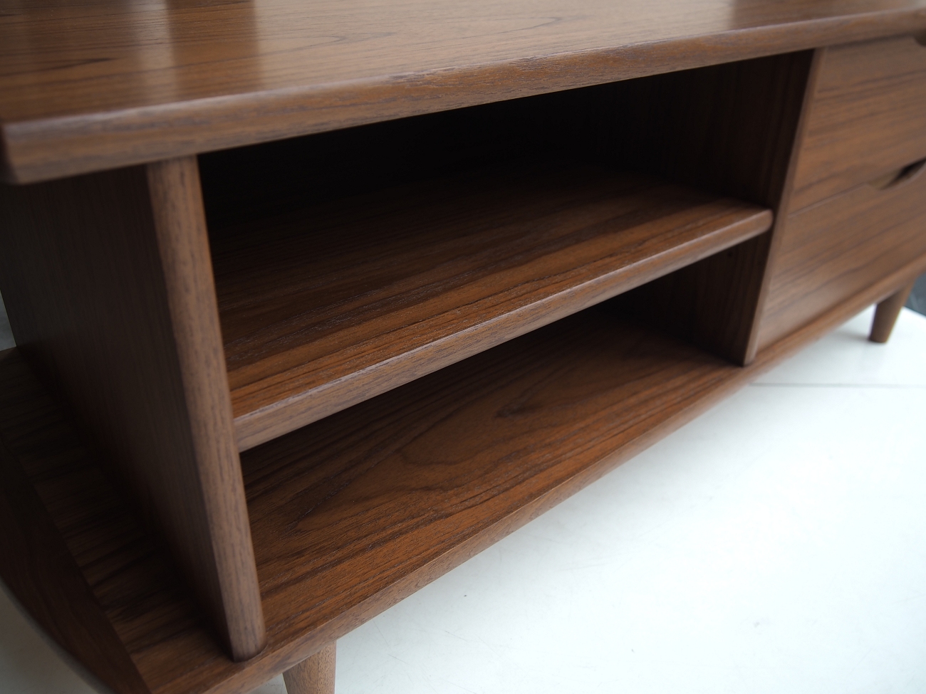 天板にはチーク板目の突板を、縁取りや角、引き出しの持ち手・脚部の丸脚などには、随所に無垢のチーク材を組み合わせ、持ち手の裏にはアクセントにオーク材を使用するなどして、美しく仕上げております。