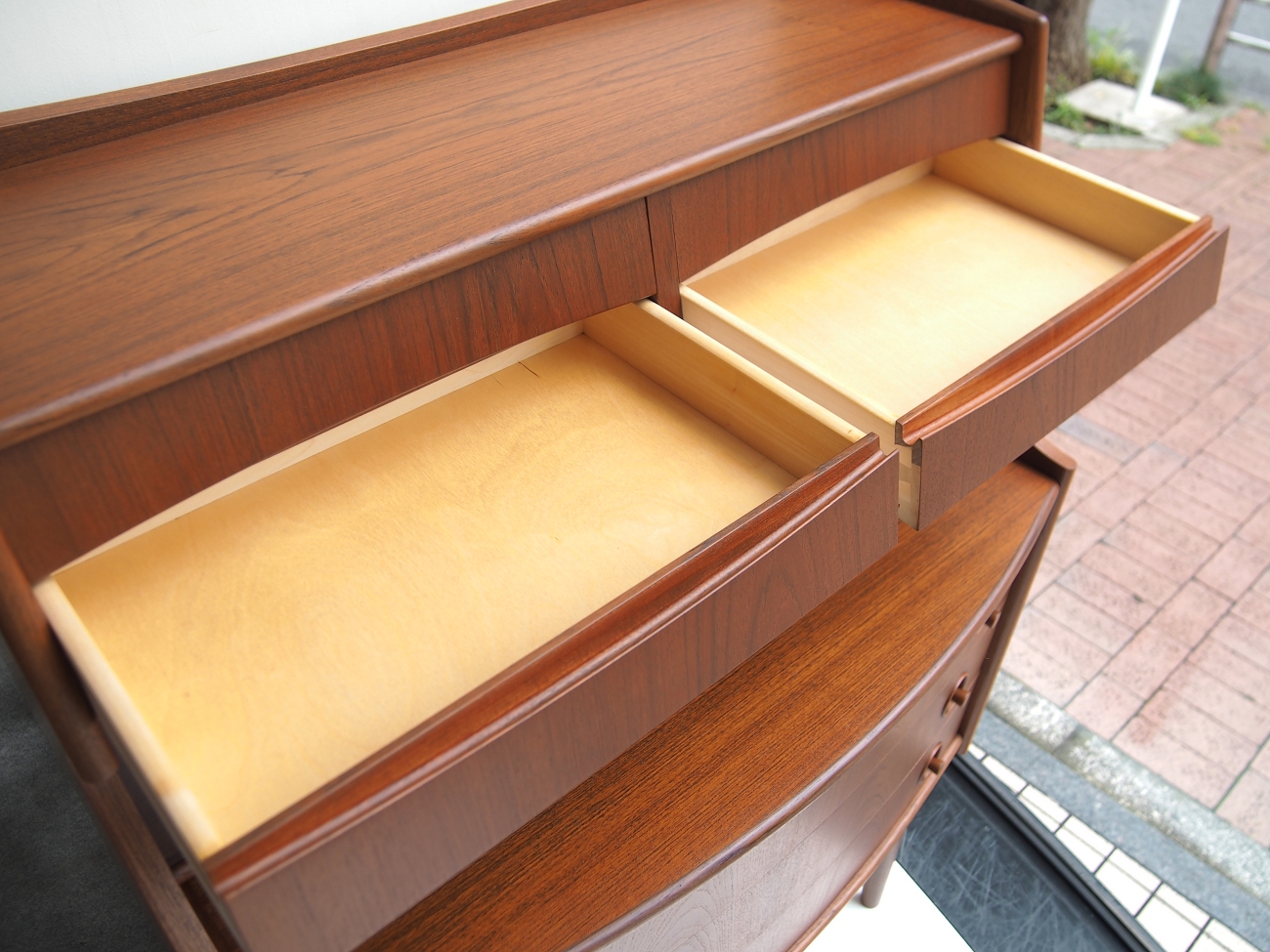 60年近く前に製造されたビューロの為、メンテナンスでは、30年の経験を持つ専門の木工職人が、一度、分解を行い、表・裏面、接着・構造・動作など、時間を掛けて細かくメンテナンスを行い、サンディングだけではなく、鉋も使用して美しく仕上げておりますので、縁の無垢の部分などは、角は立ち、直線は真っ直ぐに、曲線は美しく仕上がっております。