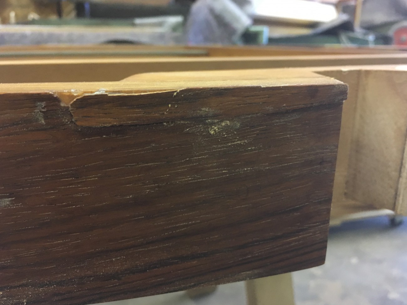 幕板の突板も細かく沢山の剥がれや浮きが御座いましたので、一つ一つ浮きを直して突板を張りなおして補修をしていきます。