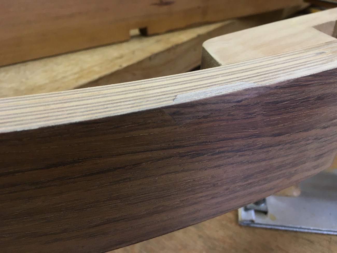 突板が薄くなっていたり剥がれていた部分は、パテ埋めだと目立ってしまうのと、浮いている部分の補修もあり、周辺の突板もかなり薄くなっていますので、問題の部分に新たに突板を張りなおして補修をしていきます。