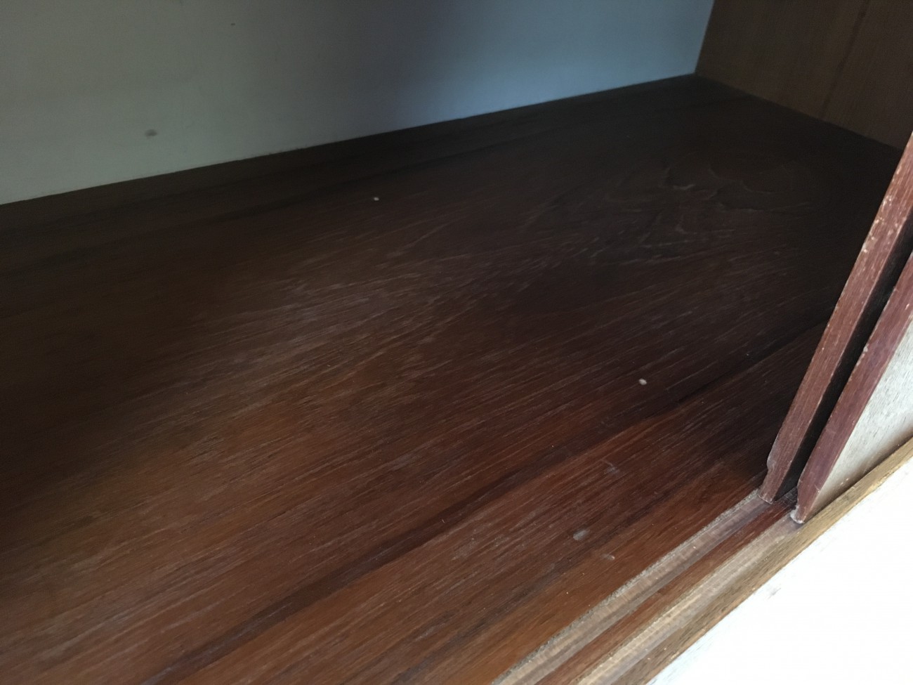 メンテナンスでは、チーク材の表面を研磨して小傷を落とし凹みも出来る限り戻して、部分的にチークの突板も張りなおしたり、扉の動作の調整や内部も綺麗にしたりと、細かくメンテナンスを行っております。