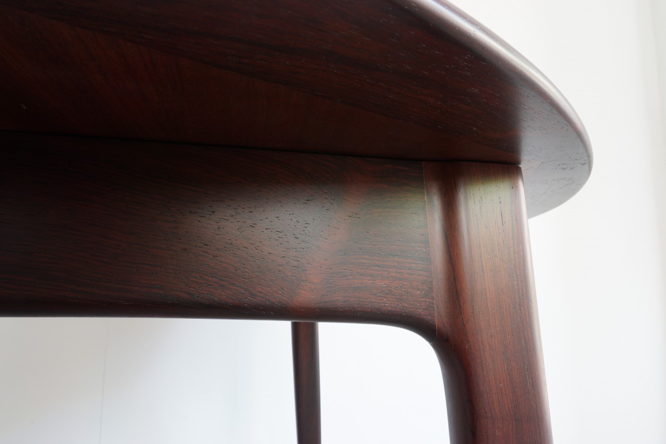 大変貴重なローズウッド材を贅沢に使用しており、木目の美しい天板の突板周りには、幅広に大きく取った縁取りや幕板・脚部に無垢のローズウッド材を贅沢に使用しています。