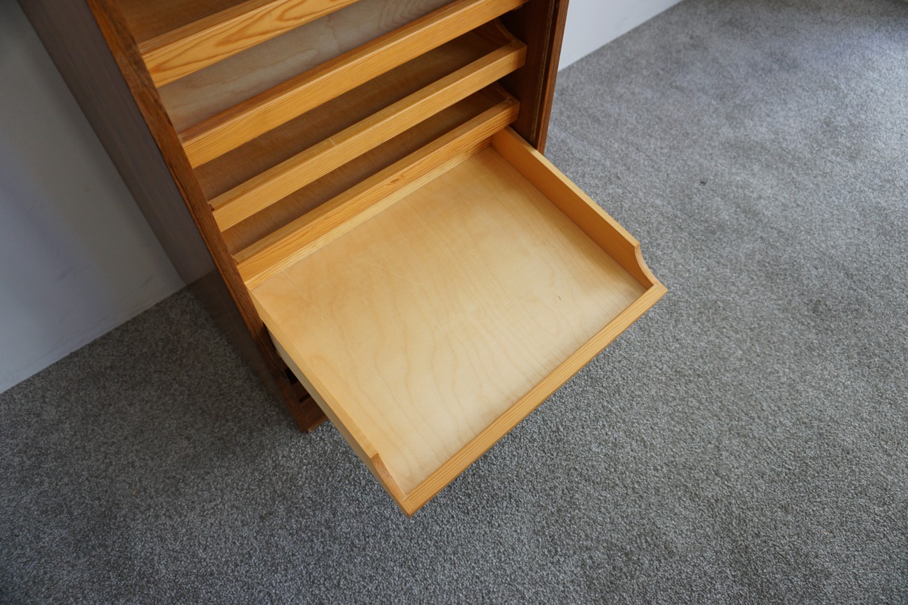 普段はローズウッドの美しい木目を見せながら、蛇腹の扉を開けると細かい引き出しが沢山ついていますので、書類や郵便物を纏めてすっきりと収納したり、小物や食器、衣類など色々な物が収納可能です。