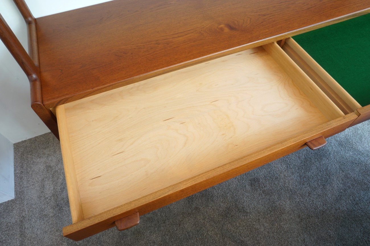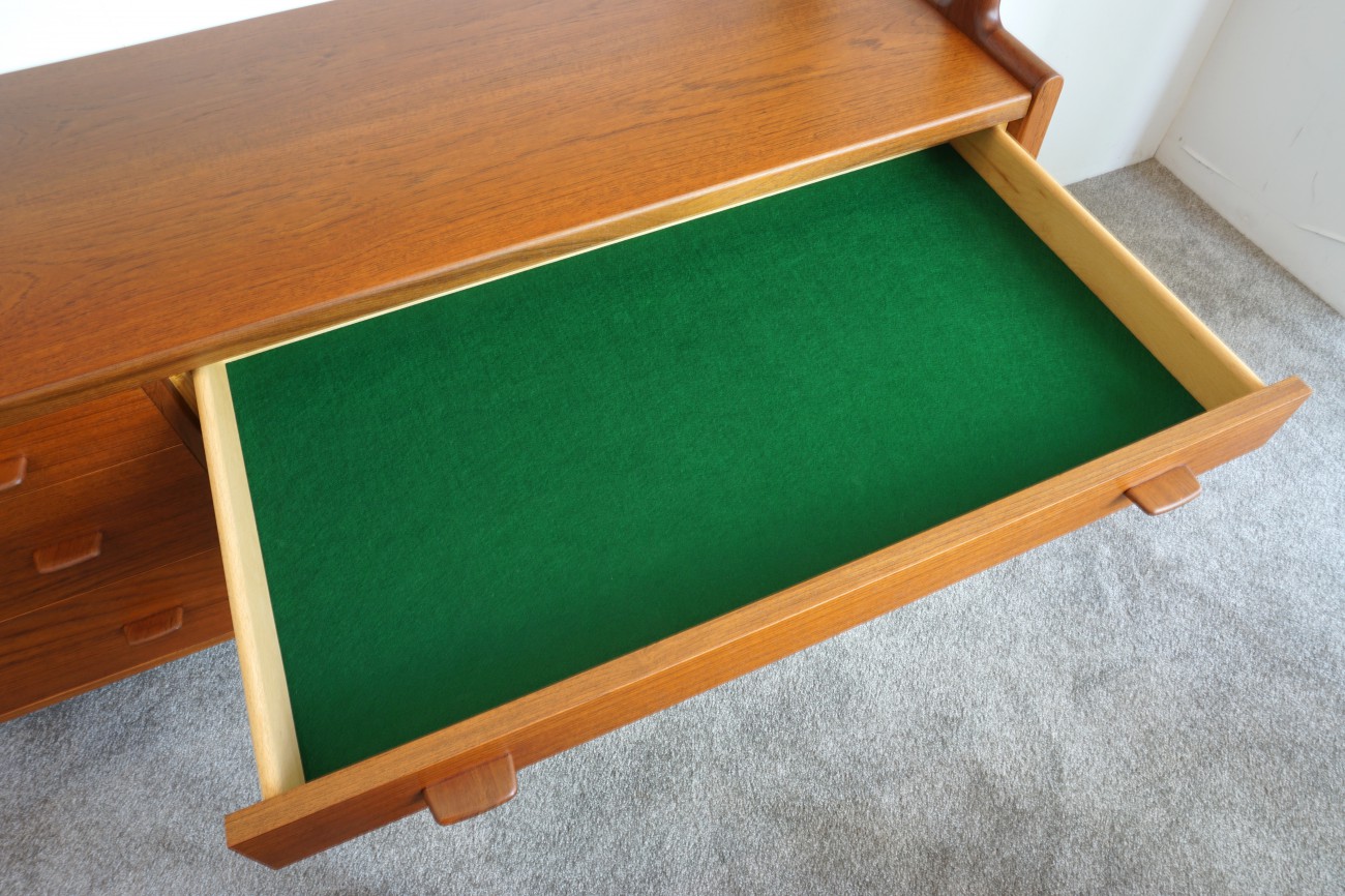 メンテナンスの際に木部のシミを取り除いたり、凹みが有れば出来る限り浮かせて戻したり、突板の欠けを同じチーク材で埋木するなどを行った上で削り直して出来る限り傷を落して仕上げていますので、とても綺麗に仕上がっています。
