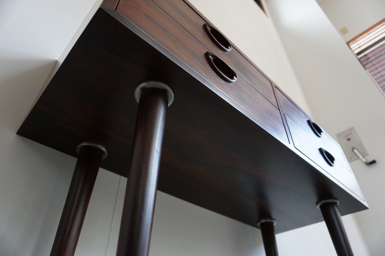 天板突板の美しい木目やチェストの顔でもある引き出し前面の木目の繋がり、無垢削り出しの持ち手や縁取りの留め加工の意匠、脚部も無垢ローズウッドをテーパーをかけて贅沢に削り出し、軽やかで美しい佇まいです。