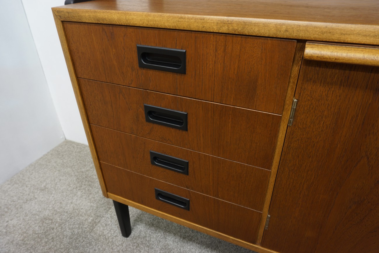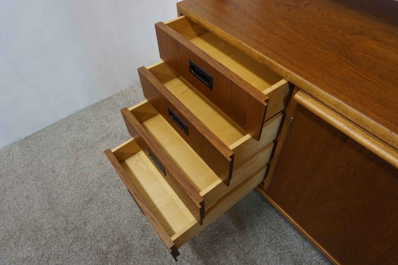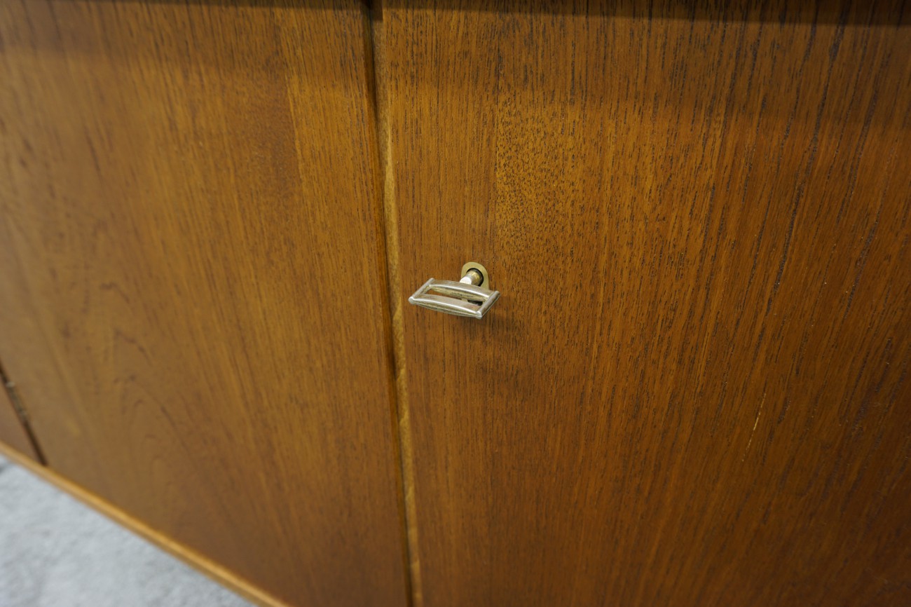 メンテナンスの際に木部のシミを取り除いたり、凹みが有れば出来る限り浮かせて戻したり、突板の欠けを同じチーク材で埋木するなどを行った上で削り直して出来る限り傷を落して仕上げています。