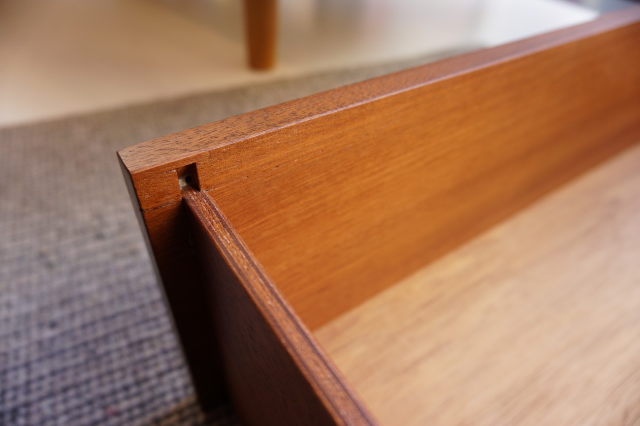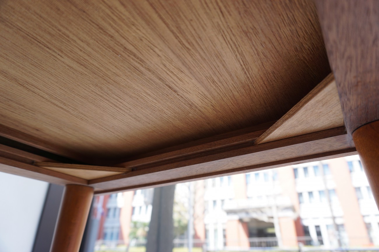 メンテナンスでは、出来る限り小傷を落し、小さな凹みもひとつひとつ出来る限り浮かせて戻しまして、表面材の細かい剥がれは、同じチーク材を用いて補修を行った上で、全面研磨・再仕上げ済みです。